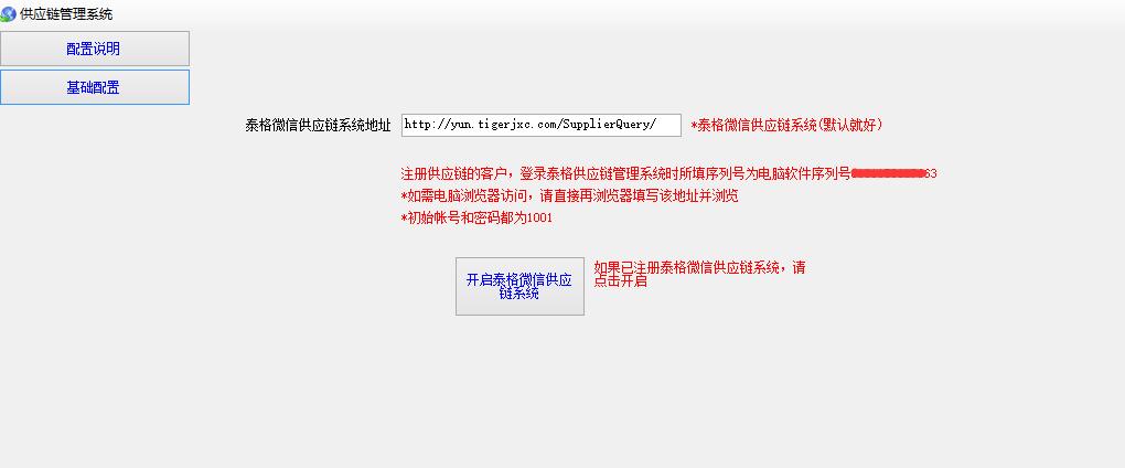 2、然后点基础配置 点击“开启泰格微信供应链系统”即可.如图