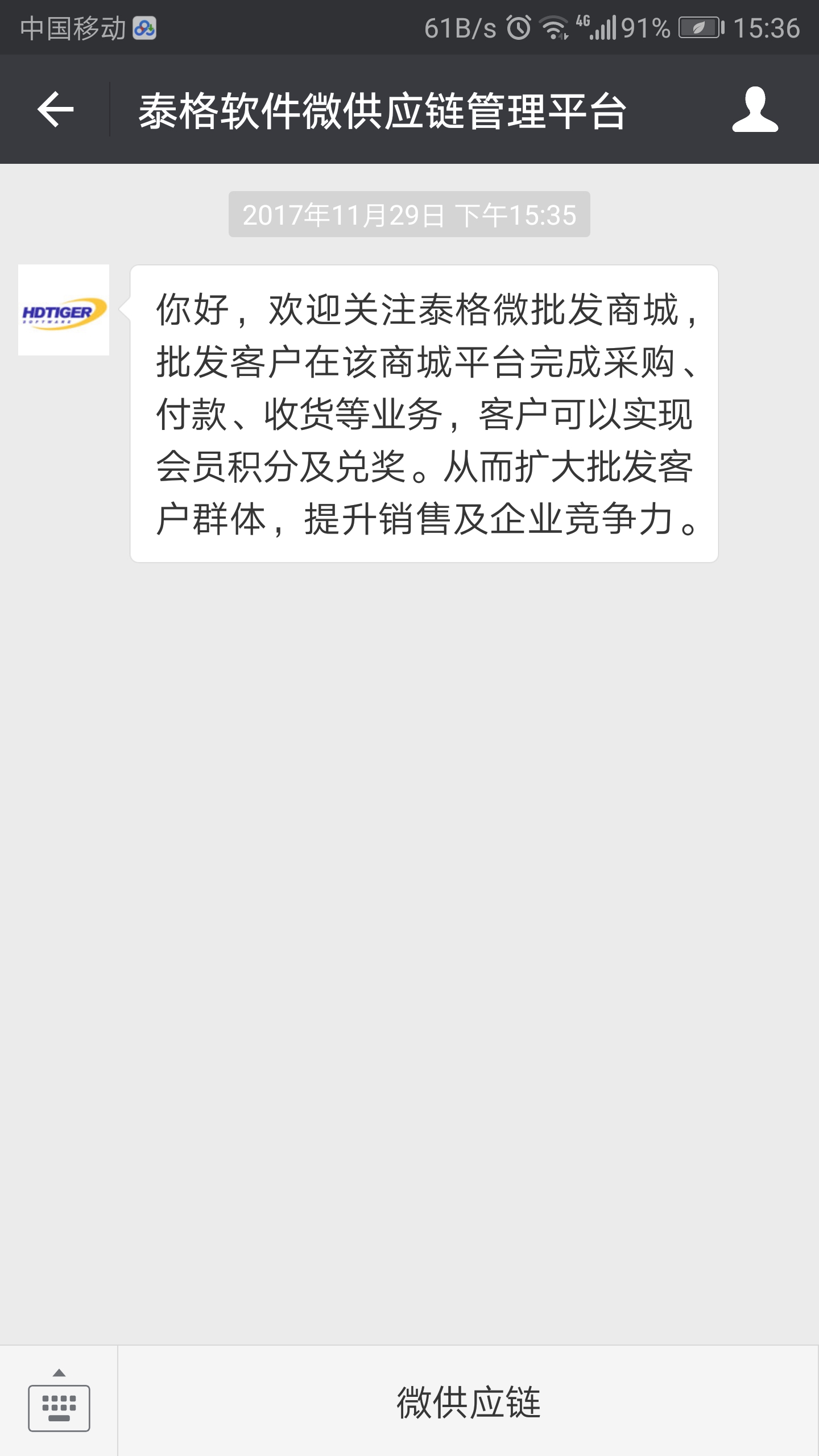 1.手机打开微信关注泰格公众号 “泰格软件微供应链管理平台”,即可使用。