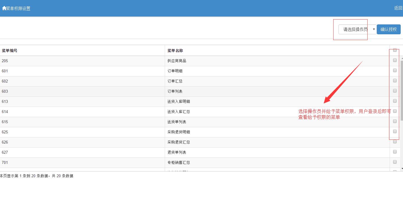 答: 登录供应链管理系统,到系统管理模块,点击菜单授权,选择需要调整菜单权限的用户,给予权限后点确定