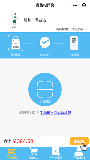 消费者只需打开商家扫码购小程序,自助扫描商品,将商品加入“购物车”,可直接买单完成支付,优惠券将自动核销,会员顾客还可同步会员积分,生成离场二维码,寻找导购核销即可,真正实现了买完即走,全程无需等待排队结账。